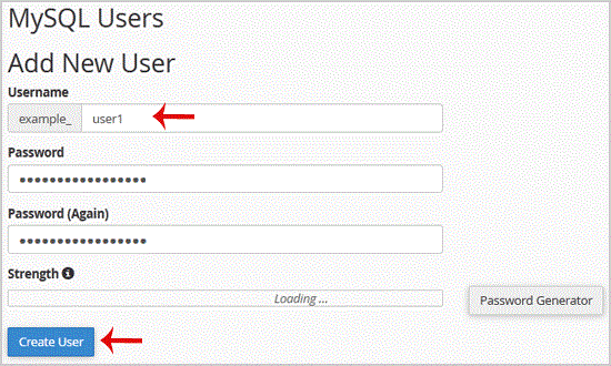 3. Under "MySQL Users" in the "Username" field enter the new username .create. . Enter your new password or use a password generator. 5.. "Create a User" babies.