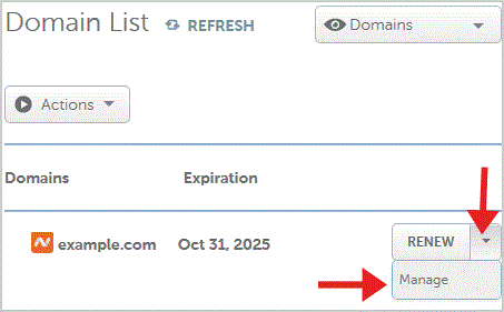 3. Under domain list, You can see list of your domains. In front of your domain click on . and select "Manage ".