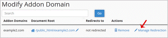 3. Under "Modify Addon Domain", locate the addon domain and click on "Manage Redirection ".