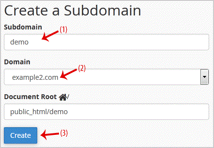 3. Under "Create a Subdomain " in the "Subdomain " field you should enter your subdomain name like "demo "(without quota) and should you have a number of domains, select the appropriate domain from the . list.