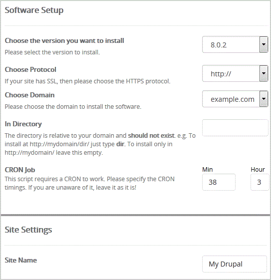 Choose the version you want to install: Leave this as it is.Choose Protocol: You can leave this as it is.Choose Domain: If you don't have multiple domains, leave this as it is.In Directory: If you want to install this in a directory, for example example.com/directory, enter the directory name. Otherwise, leave this blank to install in your main domain example.comCronjob: You can leave this as it is.