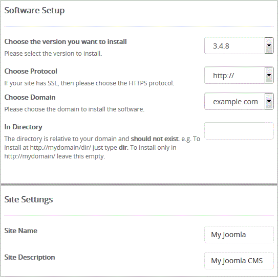 • In Directory: If you want to install this in a directory, for example example.com/directory, enter the directory name. Otherwise, leave this blank to install in your main domain example.com