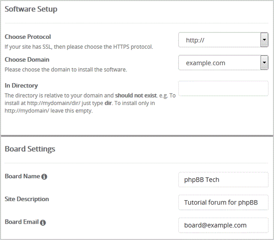 Choose Protocol: You can leave this as it is.Choose Domain: If you don't have multiple domains, leave this as it is.In Directory: If you want to install this in a directory, for example example.com/forums, enter the directory name. Otherwise, leave this blank to install in your main domain example.com