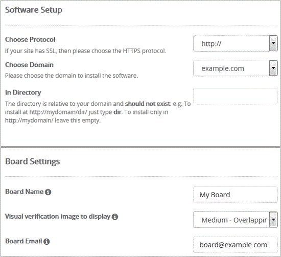 • In Directory: If you want to install this in a directory, for example example.com/forums, enter the directory name. Otherwise, leave this blank to install in your main domain example.com