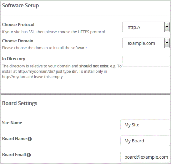 • In Directory: If you want to install this in a directory, for example example.com/forums, enter the directory name. Otherwise, leave this blank to install in your main domain example.com