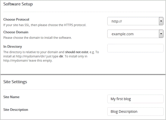 • In Directory: If you want to install this in a directory, for example example.com/directory, enter the directory name. Otherwise, leave this blank to install in your main domain example.com