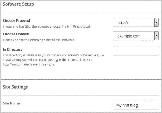 - In Directory: If you want to install this in a directory, for example example.com/directory, enter the directory name. Otherwise, leave this blank to install in your main domain example.com
