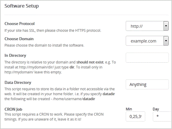 - In Directory: If you want to install this in a directory, for example example.com/directory, enter the directory name. Otherwise, leave this blank to install in your main domain example.com