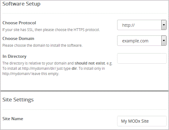 Choose Protocol: You can leave this as it is.Choose Domain: If you don't have multiple domains, leave this as it is.In Directory: If you want to install this in a directory, for example example.com/directory, enter the directory name. Otherwise, leave this blank to install in your main domain example.com