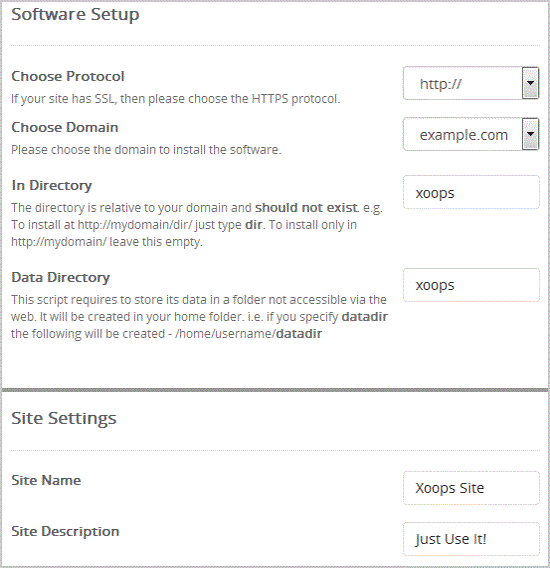 Choose Protocol: You can leave this as it is.Choose Domain: If you don't have multiple domains, leave this as it is.In Directory: If you want to install this in a directory, for example example.com/directory, enter the directory name. Otherwise, leave this blank to install in your main domain example.com- Data Directory: Leave this as it is.