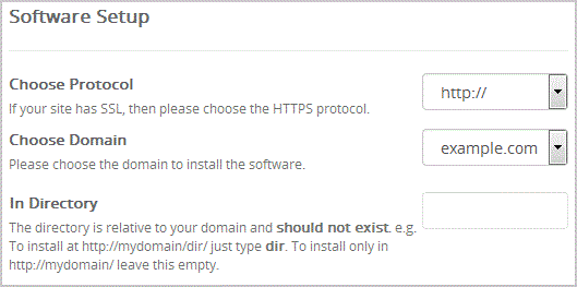 • In Directory: If you want to install this in a directory, for example example.com/directory, enter the directory name. Otherwise, leave this blank to install in your main domain example.com