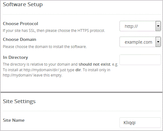- In Directory: If you want to install this in a directory, for example example.com/directory, enter the directory name. Otherwise, leave this blank to install in your main domain example.com