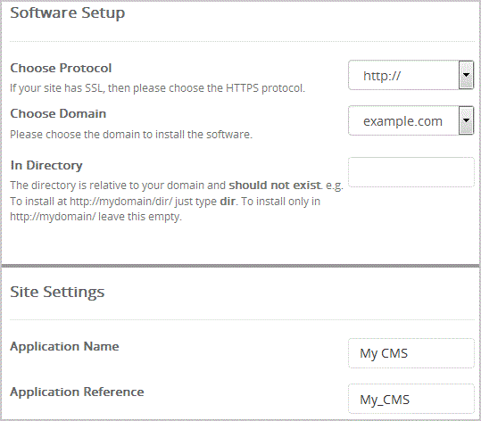 Choose Protocol: You can leave this as it is.Choose Domain: If you don't have multiple domains, leave this as it is.In Directory: If you want to install this in a directory, for example example.com/directory, enter the directory name. Otherwise, leave this blank to install in your main domain example.com