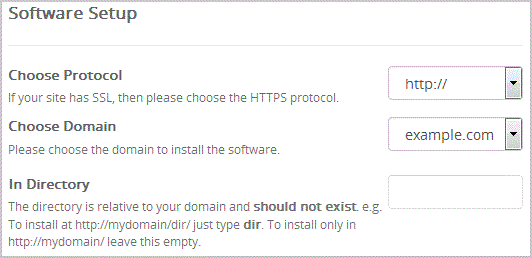 Choose Protocol: You can leave this as it is.Choose Domain: If you don't have multiple domains, leave this as it is.In Directory: If you want to install this in a directory, for example example.com/directory, enter the directory name. Otherwise, leave this blank to install in your main domain example.com