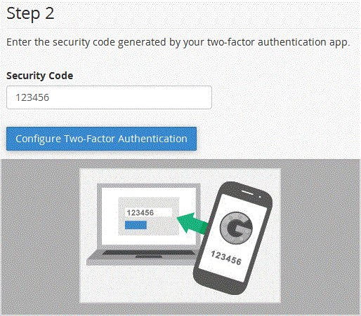. In Step 2, under the "Security Code" text box, enter your Two-Factor Authentication code and click the "Configure Two-Factor Authentication" babies.