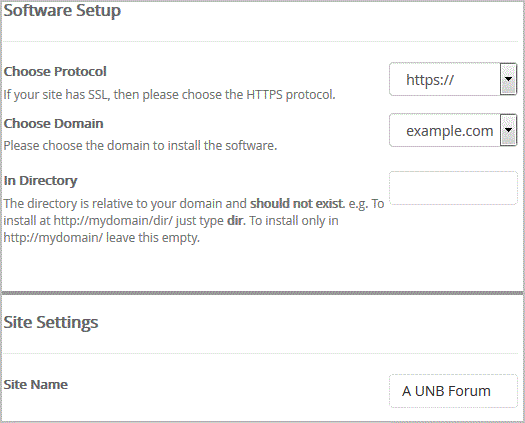 - In Directory: If you want to install this in a directory, for example example.com/forum, enter the directory name. Otherwise, leave this blank to install in your main domain example.com