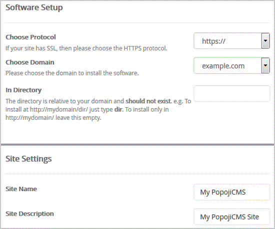Admin Username: Your new PopojiCMS username (for security reason do not use the "Administrator " or the "Admin " username.)Admin Password: Use a strong password.Admin Email: Your e-mail address.
