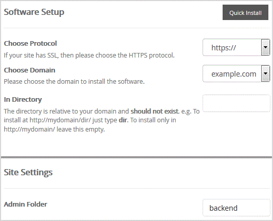 - In Directory: If you want to install this in a directory, for example example.com/directory, enter the directory name. Otherwise, leave this blank to install in your main domain example.com