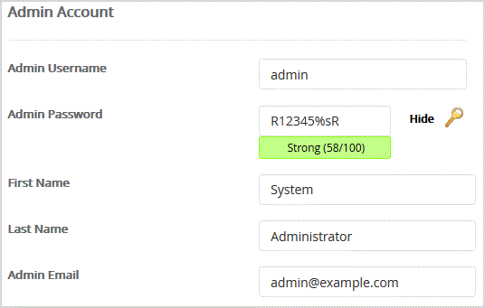 8. Under the "Admin Account" field enter the following information: